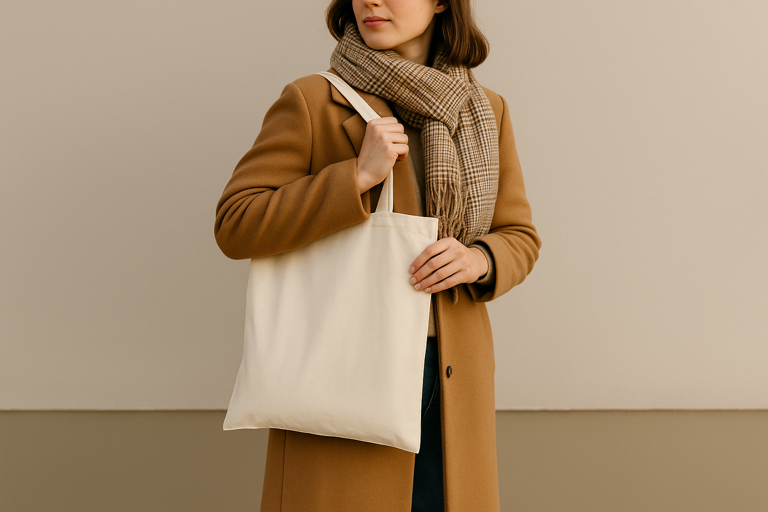Podzimní outfit s dlouhým kabátem, kotníkovými botami a teplou šálou získá s jednoduchou plátěnou taškou příjemně ležérní nádech. Zvolte tašku v neutrální barvě – béžová, hnědá nebo olivová krásně ladí s podzimní paletou. Pokud chcete outfit oživit, sáhněte po tašce s potiskem – například minimalistickým nápisem, motivem listí nebo vlastní ilustrací. Bavlněná taška v kombinaci s kabátem z vlny nebo tweedu působí přirozeně, ale zároveň neotřele.